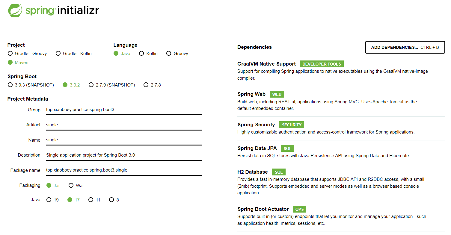 Maven项目的依赖配置在pom.xml文件,在 start.spring.io 上初始化时,选择的Spring Boot版本和依赖如下: